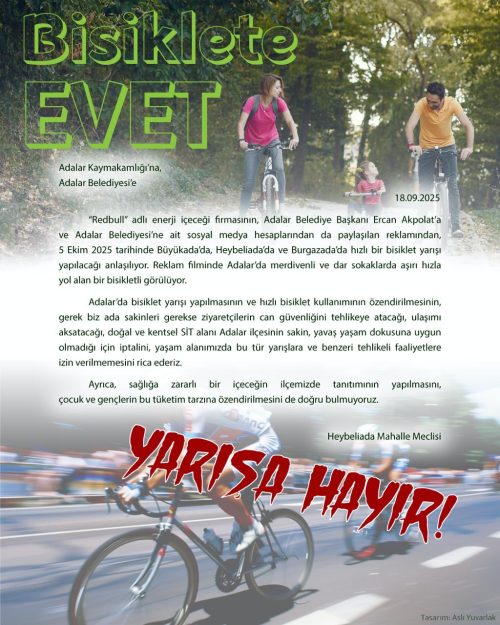Hız ve gürültüden uzak, sakin bir belde olma niteliğini korumak istediğimiz Adalar’ın sahne olmasını doğru bulmadığımız bisiklet yarışının iptal edilmesini istiyoruz.